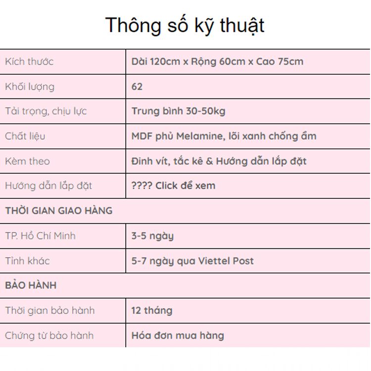 | KÍCH THƯỚC: | Dài 120cm x Rộng 60cm x Cao 75cm |