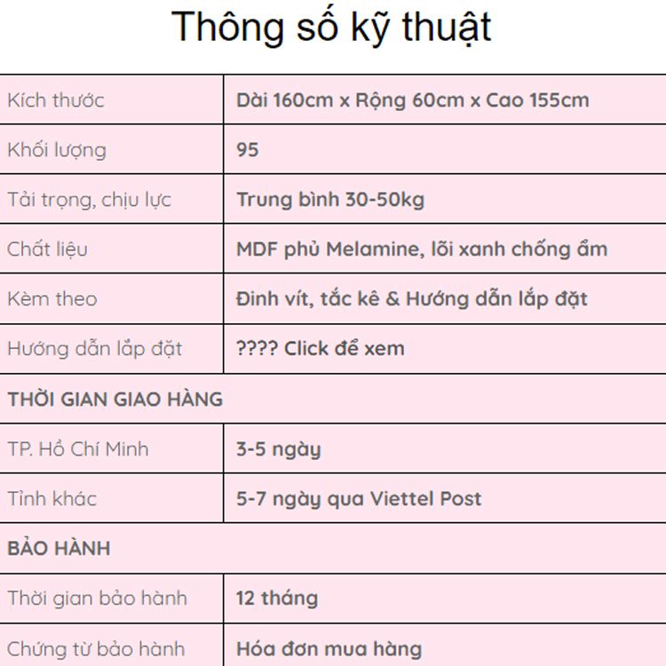 | KÍCH THƯỚC: | Dài 160 x Rộng 60 x Cao 155 (Cm) |