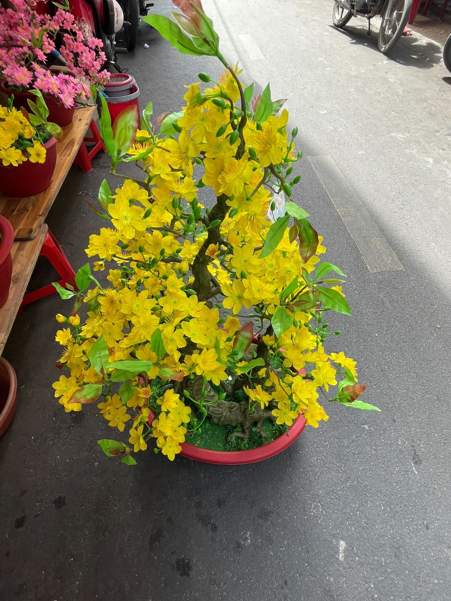 - Màu sắc: Hoa vàng tươi giống hoa Mai thật, thân nâu rêu, chậu đỏ