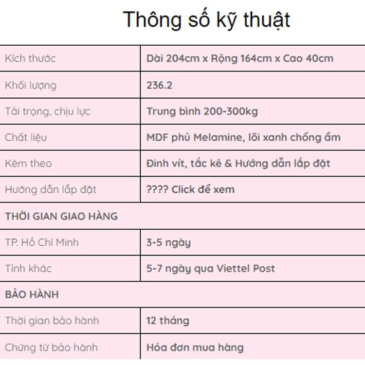 | Kích thước giường: | D 204 x R 104-124 x Cao 90 (cm) |