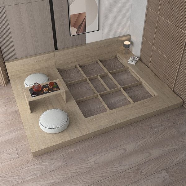 Ngoài ra, dưới thân hộp giường có các khoang hộc tủ là không gian cho gia chủ lưu trữ chăn gối, quần áo hay các vật dụng ít dùng nhằm tiết kiệm diện tích phòng ngủ và tăng thẩm mỹ cho không gian nghỉ ngơi. Bên cạnh giường ngủ được thiết kế thêm bàn trà nhỏ ngồi bệt trên sàn giường mang đậm phong cách trà Nhật Bản.