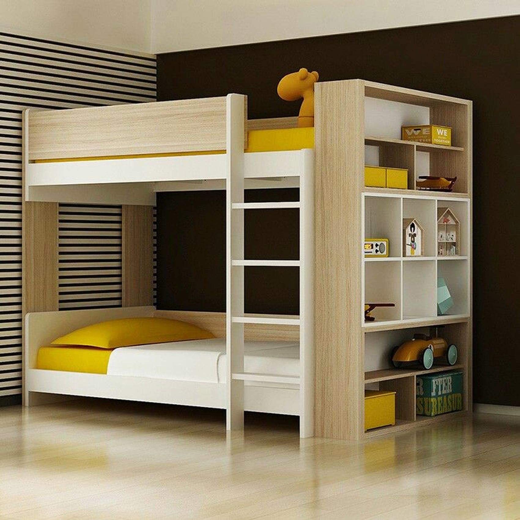 Giường tầng hiện đại là thiết kế mới cho không gian phòng ngủ. Giường tầng hiện đại kết hợp với kệ để đồ chơi, sách vở gọn gàng, tiện dụng. Giường được làm bằng chất liệu: MDF phủ melamine vân gỗ kết hợp màu trắng. Kích thước: D2350 xR1250xC1780mm. Sản phẩm được tính theo bộ. (không bao gồm chăn, gối, nệm, các vật dụng trên kệ).
