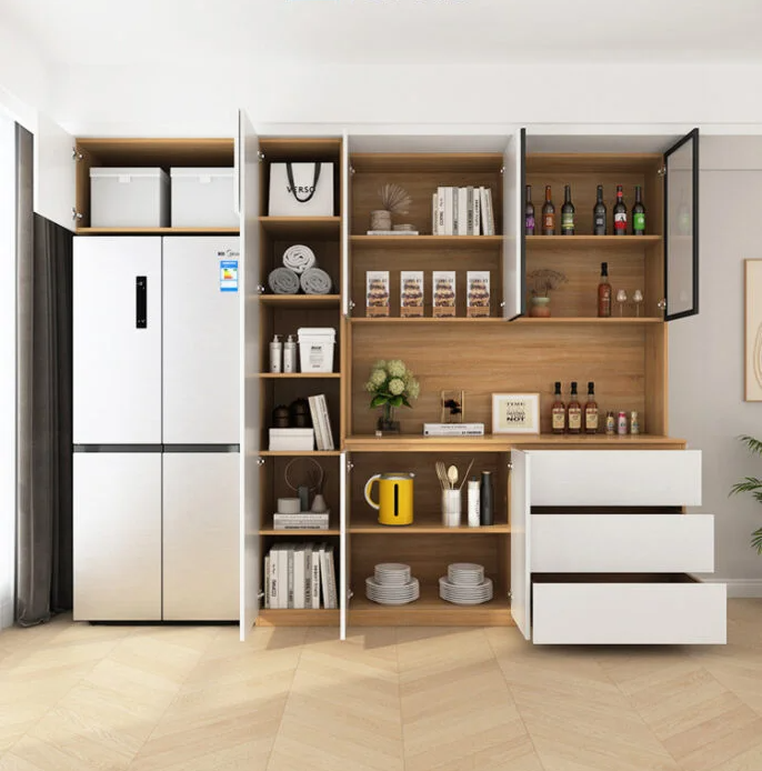 - Kệ thiết kế đơn giản nên dễ dàng sắp xếp tại nhiều vị trí: Phòng khách, phòng ăn, nhà bếp.