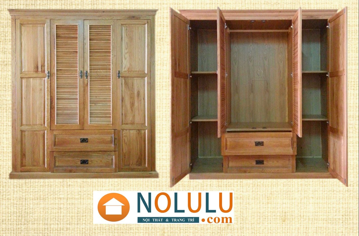 TỦ QUẦN ÁO GỖ SỒI MỸ 4 CÁNH CỬA LÁ SÁCH + 2 NGĂN KÉO (1M8)