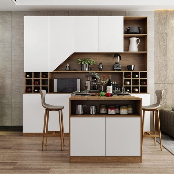 - Chất liệu: Tủ rượu kết hợp bàn ghế được làm từ gỗ MDF cốt xanh phủ melamine. Bản lề giảm chấn giúp tăng cường độ bền, tính thẩm mỹ của kệ gỗ trang trí cũng như khả năng vận hành trơn tru của những cánh kệ trang trí.